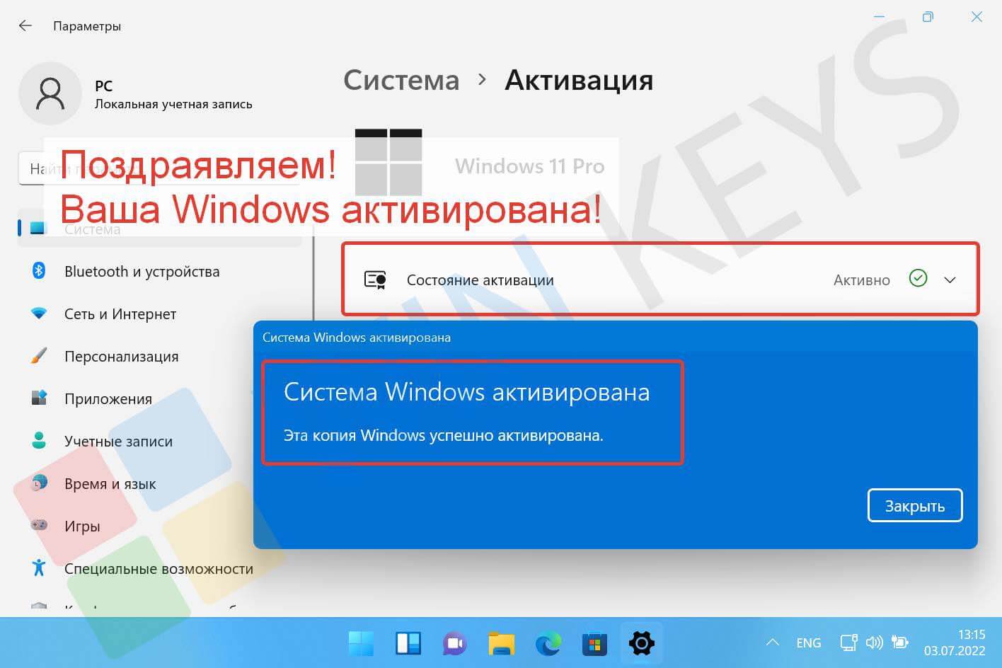 5️⃣ Активация Windows Система запустит процесс активации. После успешной активации появится подтверждающее сообщение.